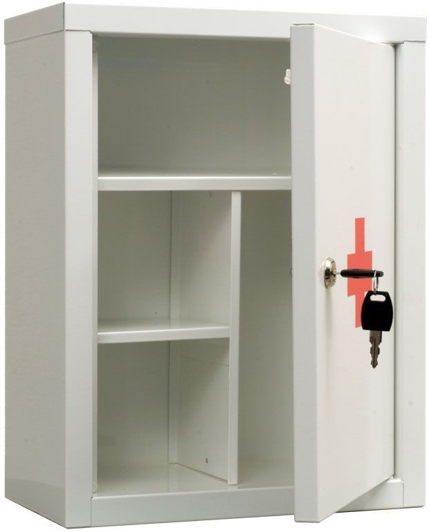 - Небольшой вес изделия достигается за счёт использования тонколистного металла в качестве основного материала. Благодаря этому аптечку можно разместить на полке шкафа или прикрепить к стене, используя имеющиеся в корпусе отверстия.