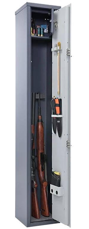 - В верхней части сейфа расположен трейзер (запирающееся на ключ отделение для патронов) размерами 199/147×246×173/90 мм. За узким трейзером остаётся свободное пространство, которое позволяет хранить ружья, по длине соответствующие высоте всего сейфа.
