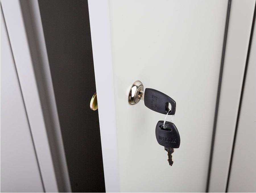 - Запирается ключевым замком «Практик» с 2 000 комбинаций, возможностью смены цилиндра и аварийным ключом.