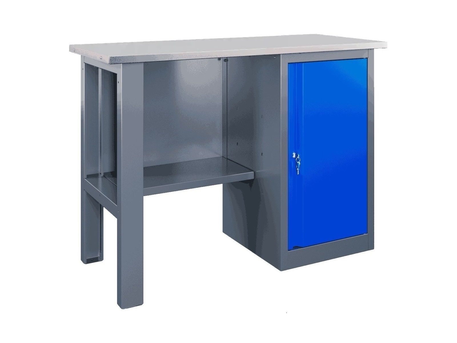 - Элегантное сочетание пыльно-серого и небесно-синего цветов придаёт верстаку привлекательный вид – это весьма существенно при установке в домашней мастерской или учебном заведении.